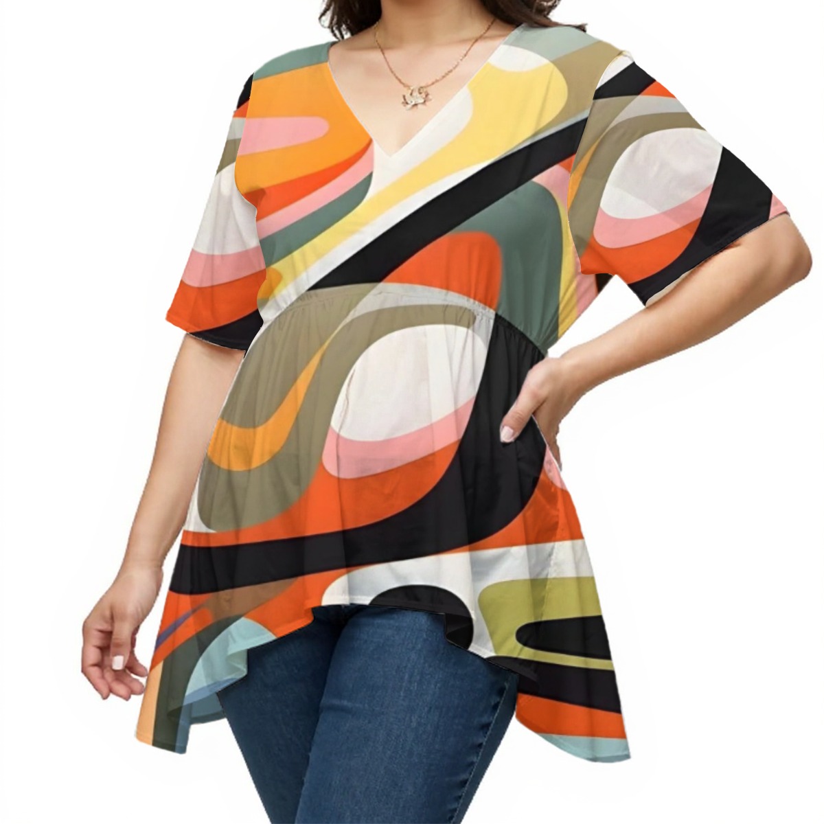 This flowing V-neck top combines modern elegance with everyday comfort. Made from lightweight polyester, it’s soft and breathable, drapes beautifully and molds to your body. The slightly sheer fabric adds a touch of sophistication while keeping things cool and stylish. With short sleeves, a nipped waist and an asymmetrical hem, it’s effortlessly casual and sophisticated. Wear it with jeans, leggings or a skirt, it’s a must-have for casual outings, brunch dates or travel.